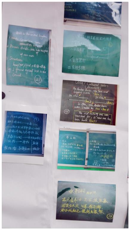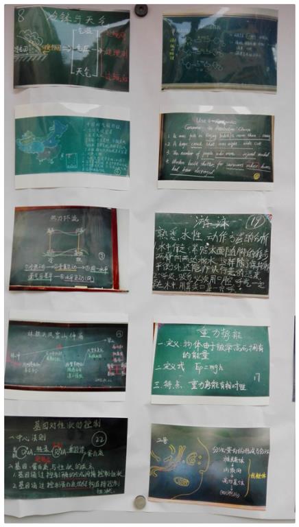 在比赛过程中,各位青年教师认真准备,积极参与,他们首先根据课题在稿纸上设计板书,再用粉笔在黑板上书写,之后拍成照片用橱窗的形式向全校师生展示。比赛充分展现了青年教师的粉笔字书写技巧和板书设计能力。教师的板书作品从整体上看,绝大多数教师板书布局合理、书写规范,富有个性。