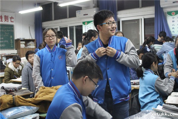 因为前期工作准备充分,发放时井然有序;同学们手捧自己选择出来的衣服,一回班就迫不及待的换上。教室里一张张洋溢的笑脸和一件件如海洋般湛蓝的服装让我们感受到青春最亮丽的色彩。