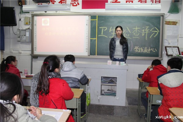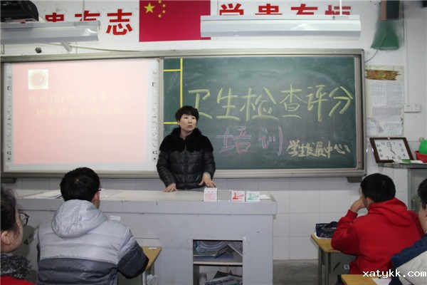 12月21日下午,郑州101中学召集各班生活委员进行日常卫生检查评分标准培训。会上陆纪军主任对各班卫生区区域的划分及卫生打扫中存在的问题、各卫生区的卫生死角做了详细介绍。他要求生活委员对本班卫生打扫要高标准、严要求。同时他还对前期卫生打扫较好的班级提出表扬,卫生打扫比较好的班级的生活委员也跟大家分享了打扫卫生的经验。