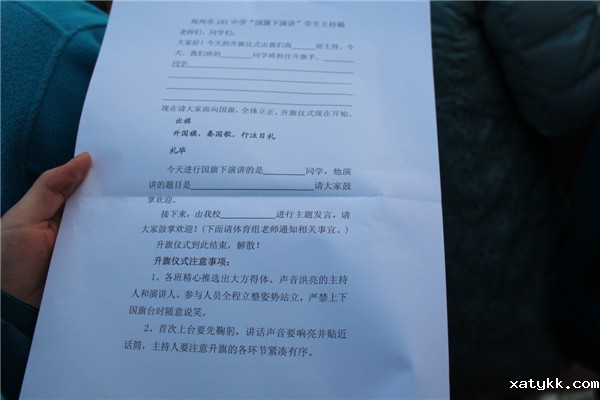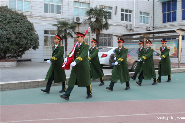 “升旗仪式现在开始,出旗、升旗……”每周一伴随着主持人嘹亮的声音,在全体师生的注目礼下,英姿飒爽的国旗护卫队队员迈着整齐的步伐护送鲜艳的五星红旗进场,行礼完毕,伴随着庄严的《中华人民共和国国歌》,五星红旗冉冉升起,迎风飘扬。国旗下演讲的同学配合默契、有秩序地上台、翻讲义夹、演讲、退场……,这一系列娴熟的动作显得优美、大方、专业,俨然是训练有素的。