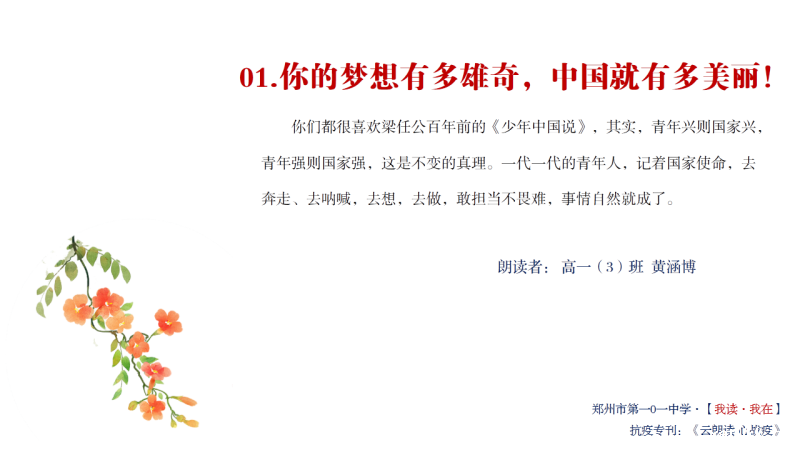 非常时期的教育,最重要的不是教师通过网络平台控制学生打卡学习,不是家长强制把孩子的时间安排得满满当当,而是让学生学会自我管理和自我教育。苏联著名教育家苏霍姆林斯基说:“只有能够激发学生去进行自我教育的教育,才是真正的教育。”教师和家长要学会适当放手,否则当他们走出校门将不知所措;家长不能总替代孩子去安排,否则孩子大学毕业仍不知路在何方。这个非常时期为大部分学生提供了一段难得的放空时光,也为自我教育提供了更多可能性。合适的指引可以让学生促进自我教育的完善和生命完整的成长。美育是达成学生完整成长的重要因素,我校将“自我教育课”中融入“美育”元素,使学生有更多的的空间去更加“完整”的生长。“诵、绘、书”齐鸣,以美育美,以美育心。校园广播站同学倾情诵读人民日报致青年的八封信回顾校史,今昔连接。再现新时期“喉舌杀敌”,引导学生从“梦想、奋斗、健康、榜样、择业、爱国、未来”等方面深思自我发展;举办抗“疫”美术展,以笔为锋,尽显赤子情怀;进行《疫·情》征文比赛,学子手中有笔,心中有光。充分发挥群团组织作用,树立自我发展榜样。共青团是学生团体中的先锋军,抗疫一战,舍我其谁!我校制作的《战疫到底系列微团课》以“火炬”的姿态,在青年学生的意识形态塑造过程中产生耀眼的光芒和深远的影响。