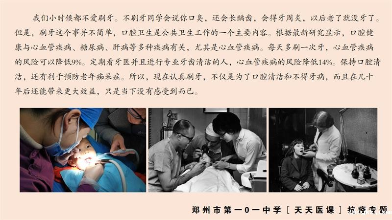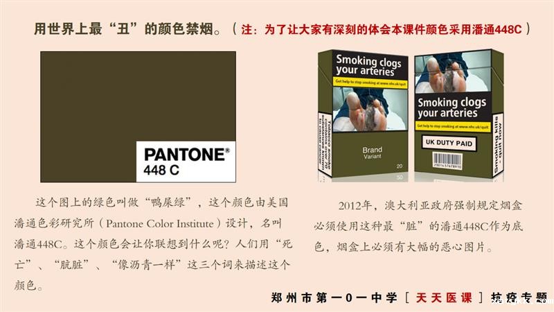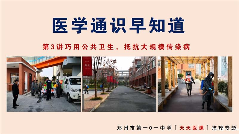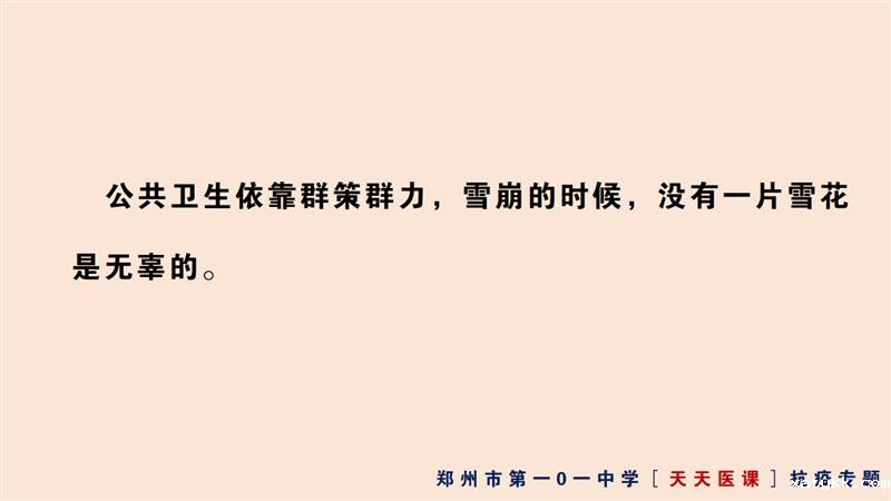 亲爱的家长、同学们你们好,欢迎来到郑州市第一0一中学战疫健康课:《医学通识早知道》。这次新冠肺炎疫情是新中国成立以来在我国发生的传播速度最快、感染范围最广、防控难度最大的一次重大突发公共卫生事件。1月25日河南省省长宣布河南启动“一级应急响应”,整个疫情防控好似是一场公共卫生领域的阻击战,从“人员隔离”到“封城封路”,从“个人防护”到“群防群守”,这些无不涉及公共卫生领域,在很多人眼里,公共卫生不外乎就是处理垃圾、给水消毒和管理卫生等等,好像没什么大不了的。但是如果真么想,可就想的太简单了。比如含碘盐、打疫苗、饮用水、食品安全、垃圾分类,甚至口腔卫生这些都是共卫生的范畴,澳大利亚政府甚至用过世界上最“丑”的颜色-潘通448C(鸭屎绿)这种颜色成功实现了全民禁烟。开学前的监测