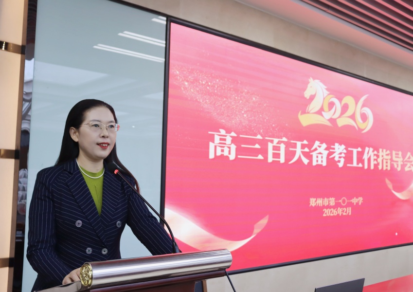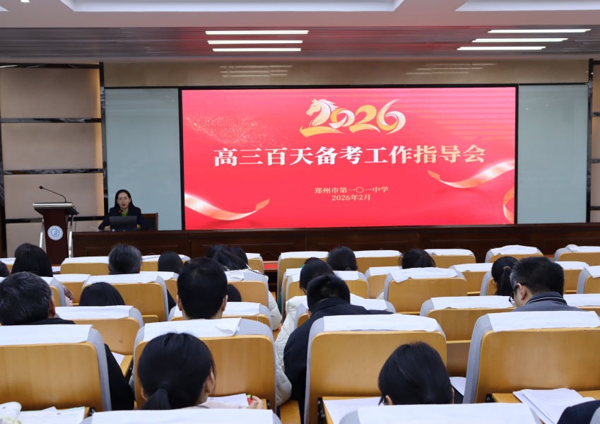 春回大地,万象更新;百日倒计时,战鼓已催征。25日下午, 在图书馆一楼报告厅召开高三百天备考工作指导会。校长谭纪萍、副校长王国威、教师发展中心主任朱春英,与高三全体教师齐聚一堂、共同研讨,统筹部署2026届高考百日冲刺相关工作。本次会议聚焦寒假管理关键阶段,统筹规划百日备考各项安排,凝聚共识、精准发力,为学生决胜高考保驾护航。