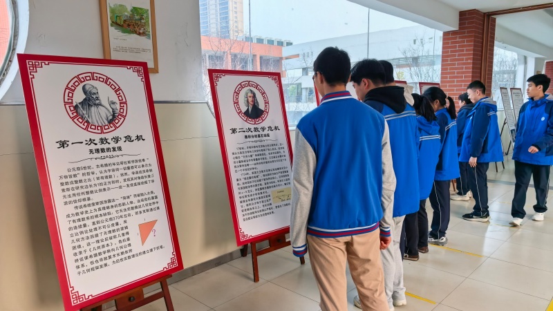 作为学科节的首个活动,“数海拾贝,穿越时空的对话(数学展)”于39日在教学楼二楼连廊一侧率先拉开帷幕。现场布置的“数学史、中外数学家”主题展板,吸引了众多师生驻足观看。展览不仅梳理了数学发展的辉煌历程,更展现了数学家们的探索精神与卓越贡献,为同学们打开了一扇了解数学文化的窗口。